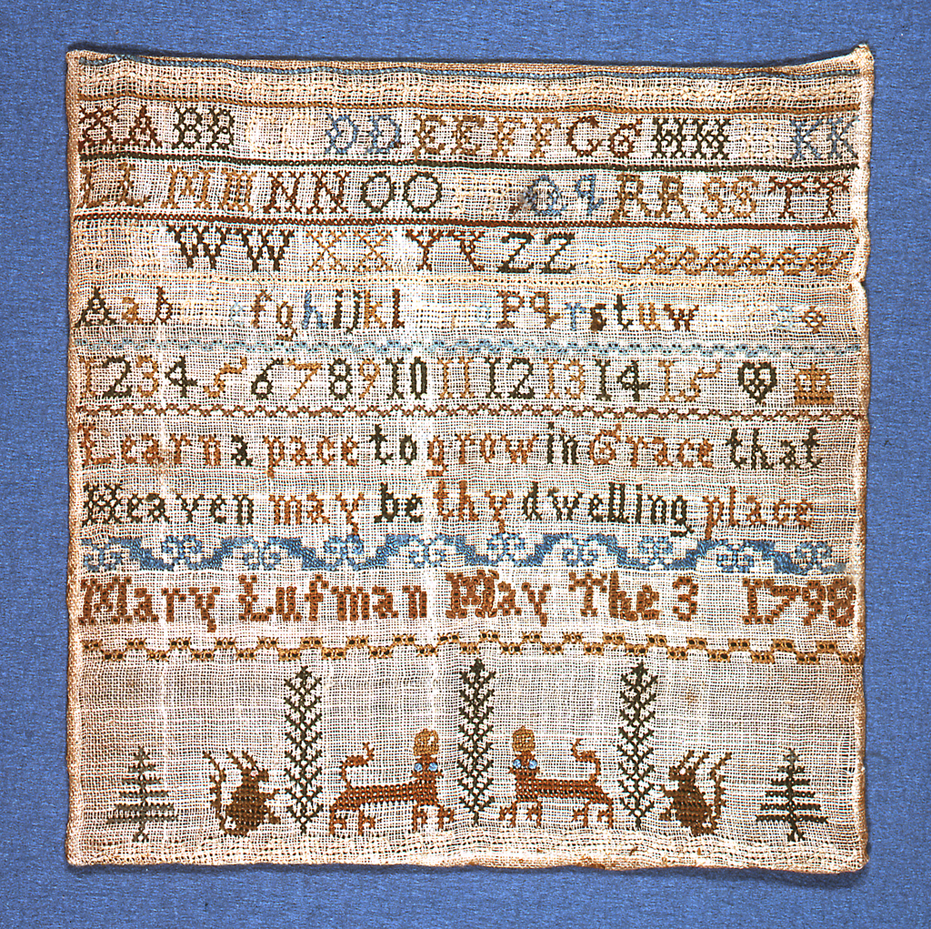 This is a Sampler. It was embroidered by Mary Lufman. It is dated 1798 and we acquired it in 1976. Its medium is silk embroidery on linen foundation and its technique is embroidered in counted cross, satin and eye stitches on plain weave foundation. It is a part of the Textiles department.