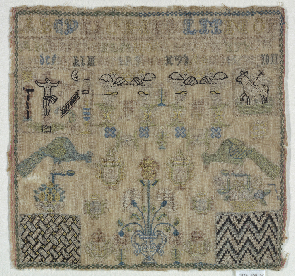 This is a Sampler. We acquired it in 1976. Its medium is silk embroidery on wool foundation and its technique is embroidered in cross, half cross, satin, stem and knot stitches on plain weave foundation. It is a part of the Textiles department.