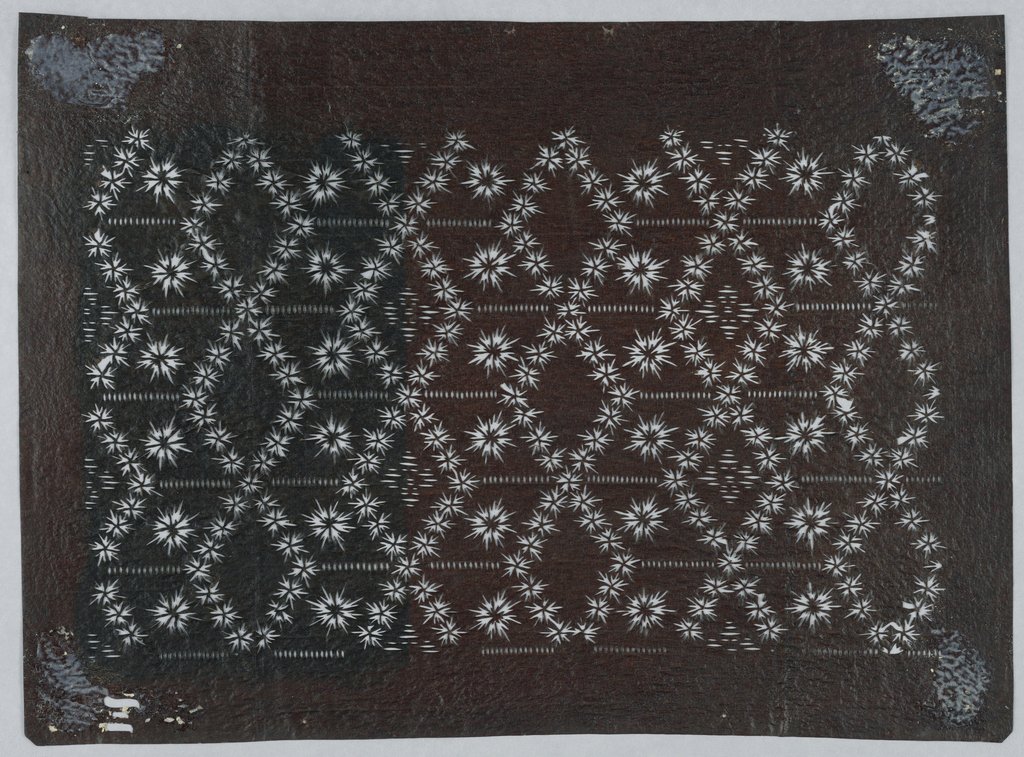 This is a Katagami. It is dated late 19th–early 20th century and we acquired it in 1976. Its medium is cut mulberry paper treated with persimmon tannin and silk thread. It is a part of the Drawings, Prints, and Graphic Design department.
