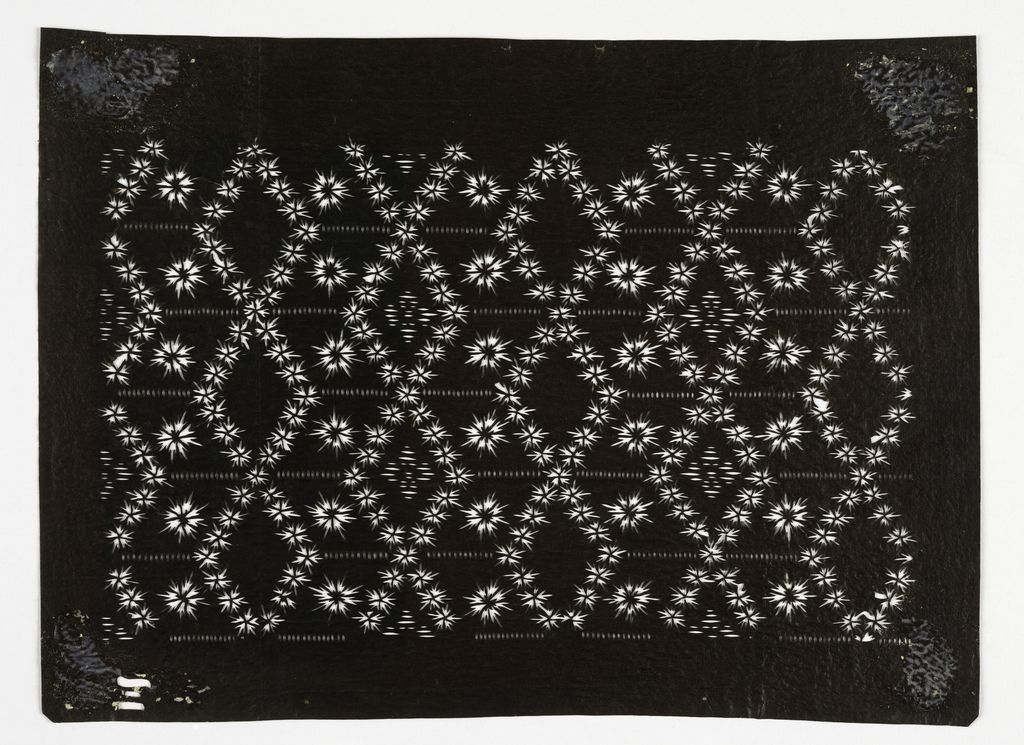 This is a Katagami. It is dated late 19th–early 20th century and we acquired it in 1976. Its medium is cut mulberry paper treated with persimmon tannin and silk thread. It is a part of the Drawings, Prints, and Graphic Design department.