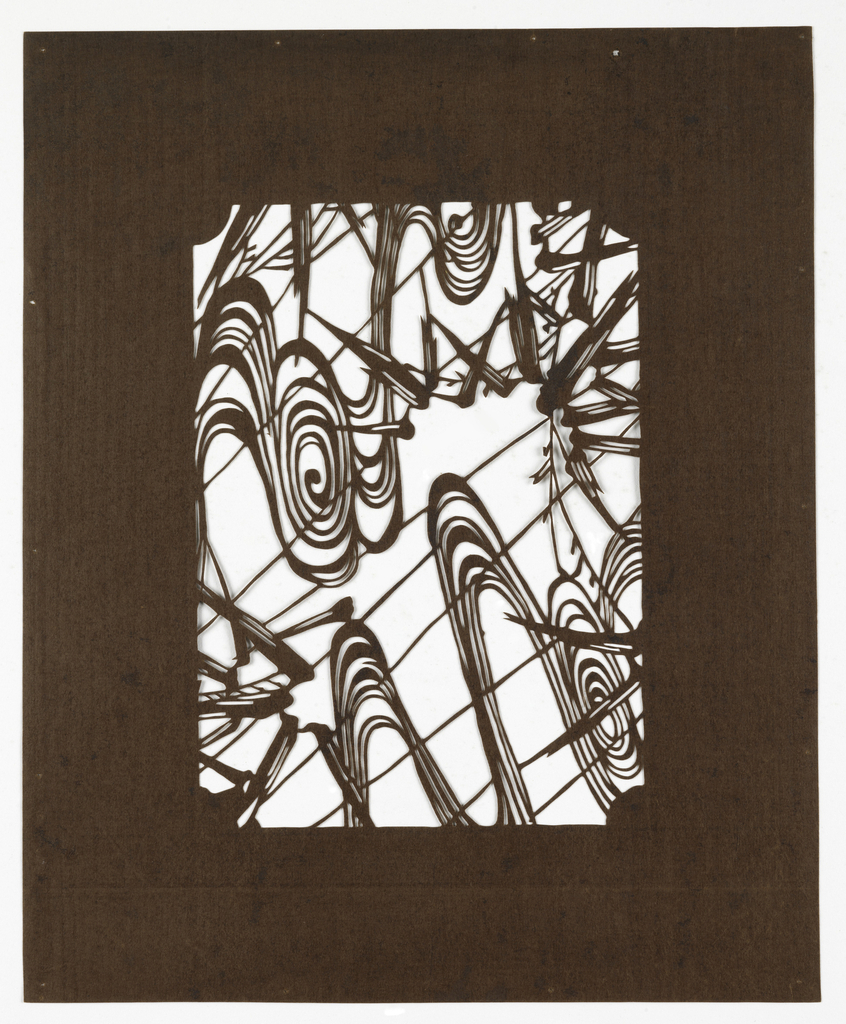 This is a Katagami. It is dated late 19th–early 20th century and we acquired it in 1976. Its medium is cut mulberry paper treated with persimmon tannin and silk thread. It is a part of the Drawings, Prints, and Graphic Design department.