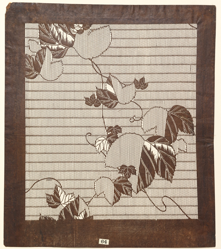 This is a Katagami. It is dated late 19th–early 20th century and we acquired it in 1976. Its medium is mulberry paper (kozo washi) treated with fermented persimmon tannin (kakishibu), and silk threads (itoire). It is a part of the Drawings, Prints, and Graphic Design department.