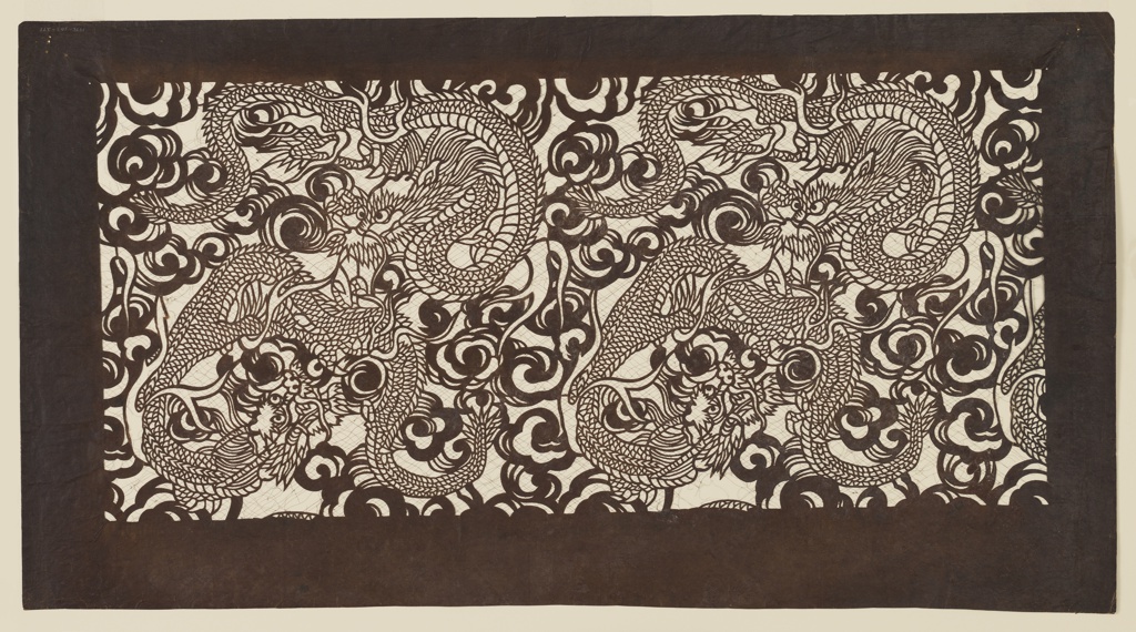 Stencil, Dragons in Clouds; Japan; mulberry paper (kozo washi) treated with fermented persimmon tannin (kakishibu), and silk threads (itoire); 49 × 89 cm (19 5/16 × 35 1/16 in.) Mat: 71 × 91.3 cm (27 15/16 × 35 15/16 in.); Gift of Helen Snyder; 1976-103-277