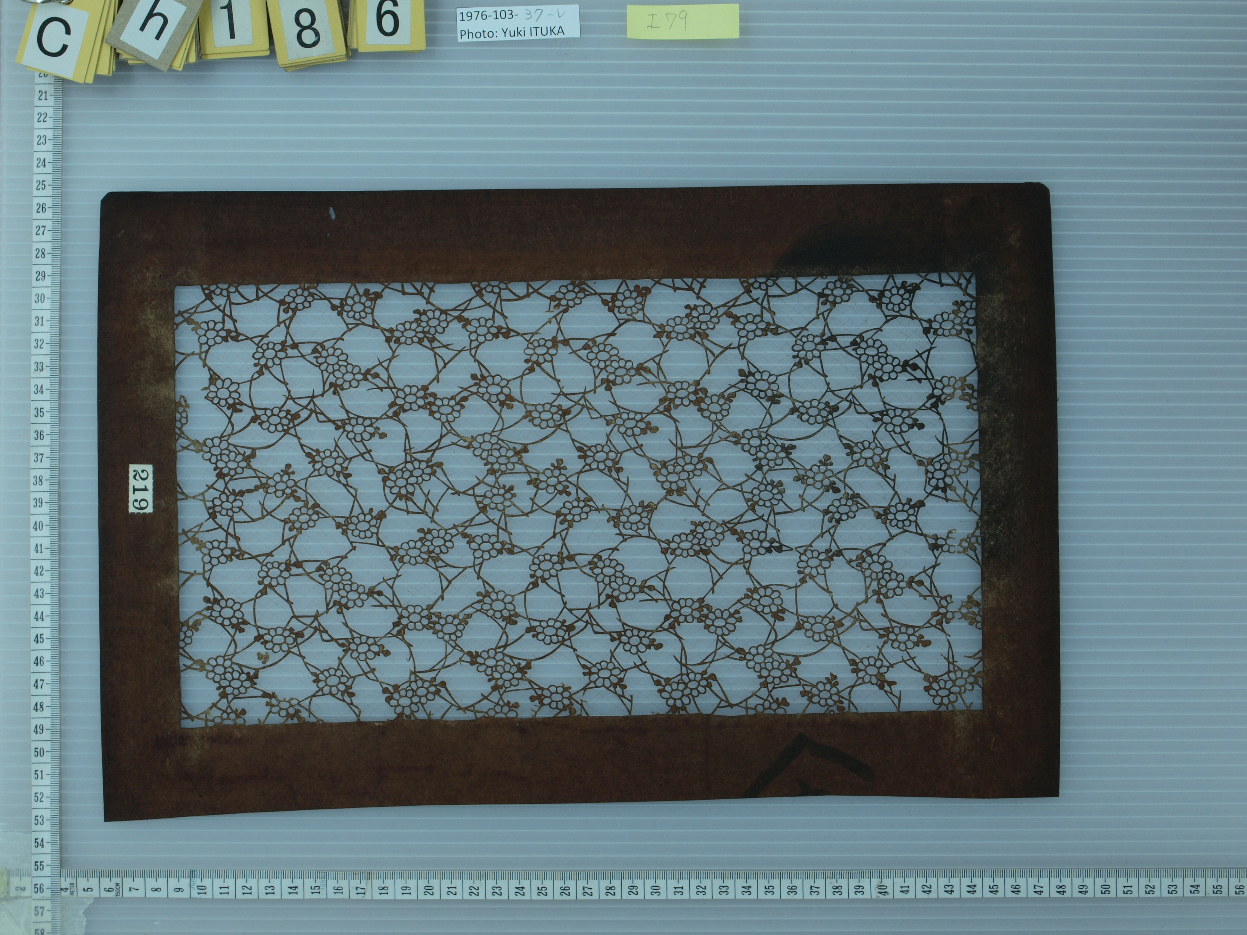 This is a Katagami. It is dated mid 18th - early 19th century and we acquired it in 1976. Its medium is mulberry paper (kozo washi) treated with fermented persimmon tannin (kakishibu), and silk threads (itoire). It is a part of the Drawings, Prints, and Graphic Design department.