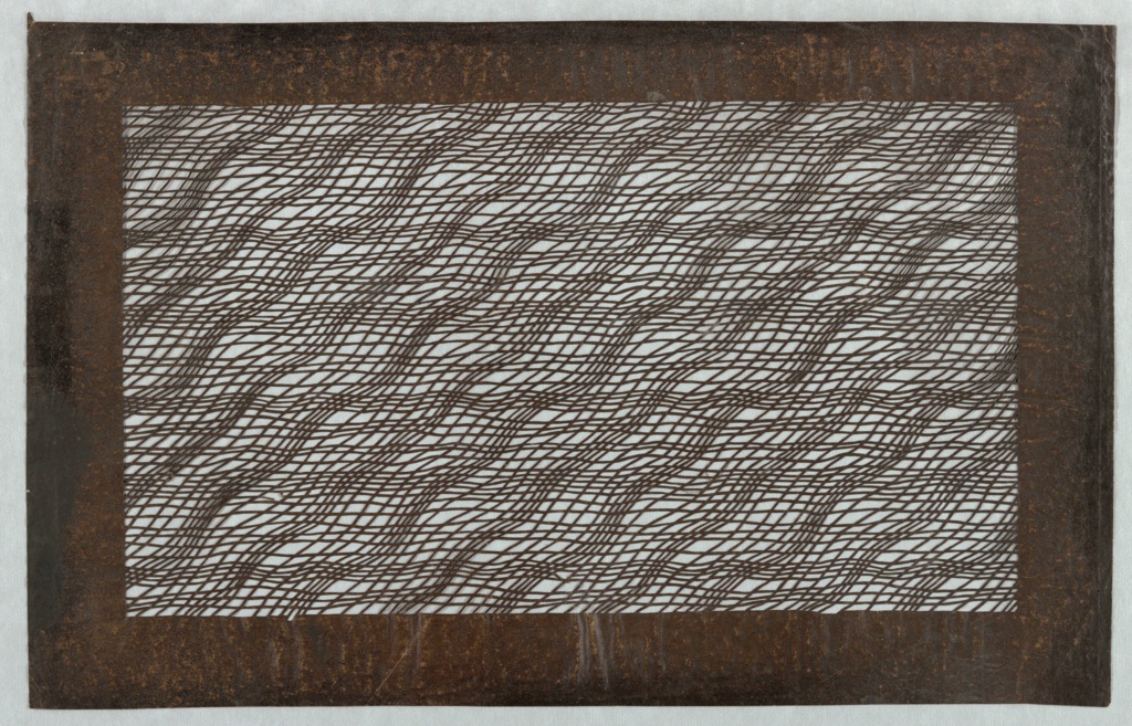 This is a Katagami. It is dated mid 18th - early 19th century and we acquired it in 1976. Its medium is mulberry paper (kozo washi) treated with fermented persimmon tannin (kakishibu), and silk threads (itoire). It is a part of the Drawings, Prints, and Graphic Design department.