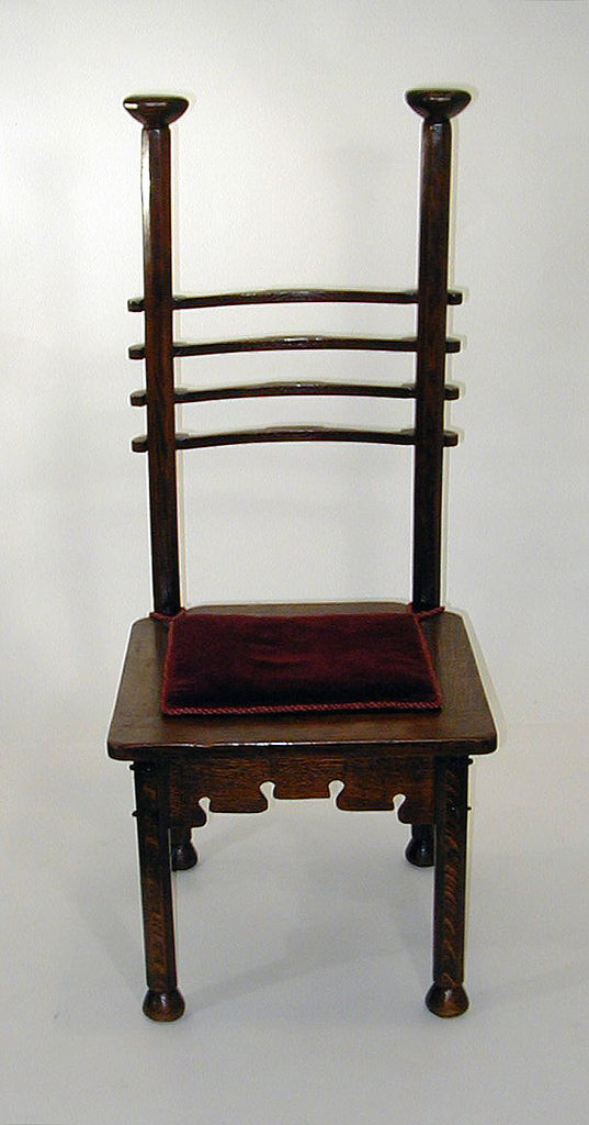 This is a side chair. It was designed by Charles Rohlfs. It is dated 1901 and we acquired it in 1976. Its medium is oak, leather cushions (modern replacements). It is a part of the Product Design and Decorative Arts department.