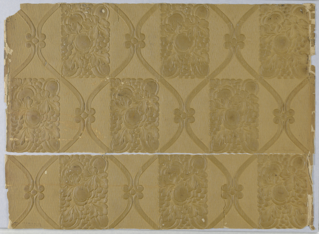 This is a Lincrusta dessin. It is dated 1875–85 and we acquired it in 1977. Its medium is lincrusta dessin. It is a part of the Wallcoverings department.