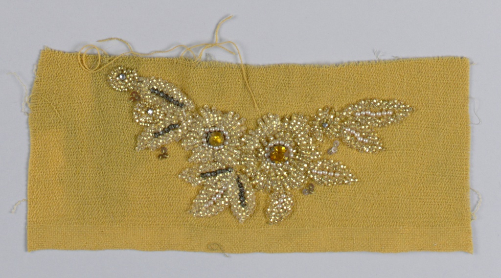 This is a Embroidery sample. It is dated 1930s and we acquired it in 1977. Its medium is wool, glass beads, rhinestones, faux pearls, sequins and its technique is embroidery on a 2-2 plain weave. It is a part of the Textiles department.