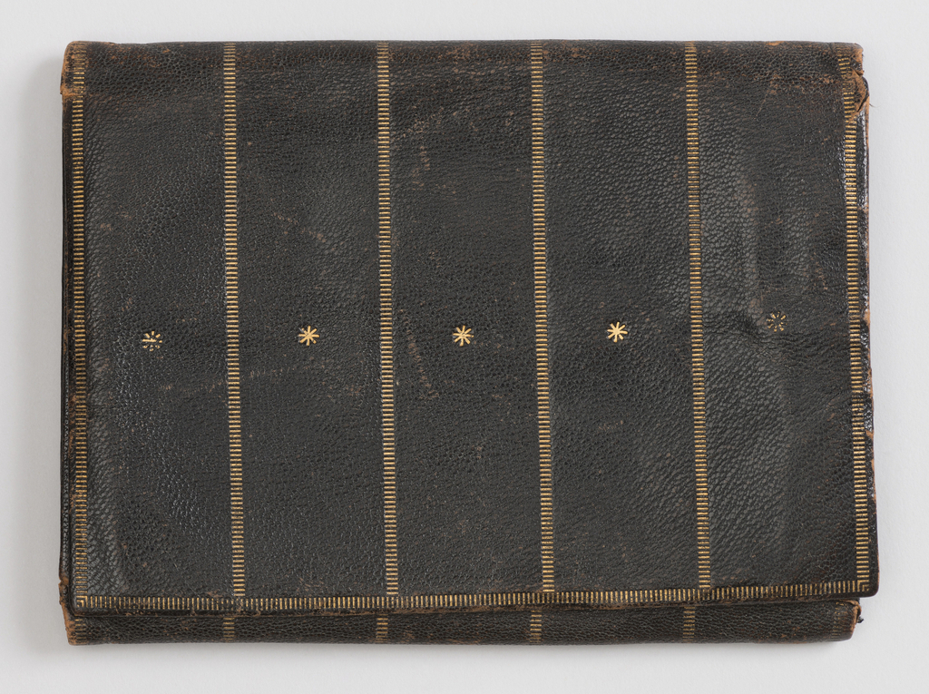 This is a Wallet. It is dated ca. 1910 and we acquired it in 1978. Its medium is tooled and stained leather, silk lining. It is a part of the Product Design and Decorative Arts department.