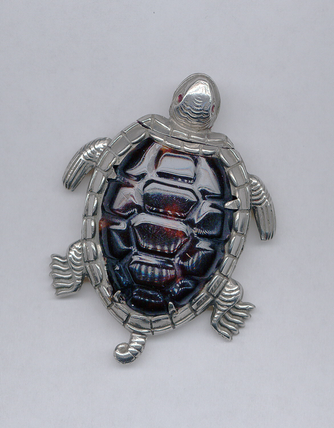 Turtle Matchsafe; Manufactured by T. Johnson; England; plated brass, celluloid, enamel; 5.9 x 4.9 x 1.4 cm (2 5/16 x 1 15/16 x 9/16 in. ); Gift of Stephen W. Brener and Carol B. Brener; 1978-146-128