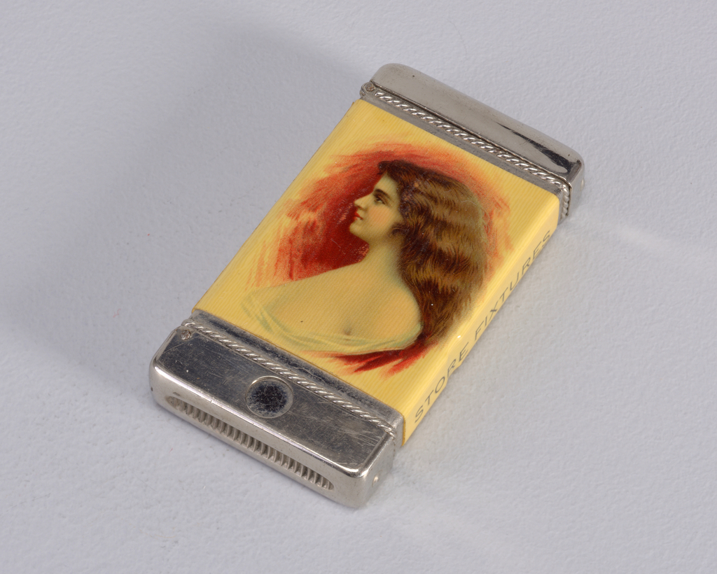 This is a Matchsafe. It is dated early 20th century and we acquired it in 1978. Its medium is celluloid, metal. It is a part of the Product Design and Decorative Arts department.