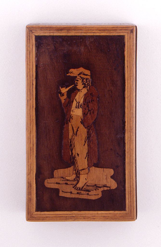 Peasant Man Smoking a Pipe Matchsafe; Italy; inlaid wood, enamel, sandpaper; 6.6 x 3.6 x 1.5 cm (2 5/8 x 1 7/16 x 9/16 in. ); Gift of Stephen W. Brener and Carol B. Brener; 1978-146-410