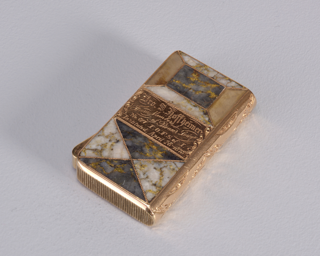 This is a Matchsafe. We acquired it in 1978. Its medium is gold. It is a part of the Product Design and Decorative Arts department.