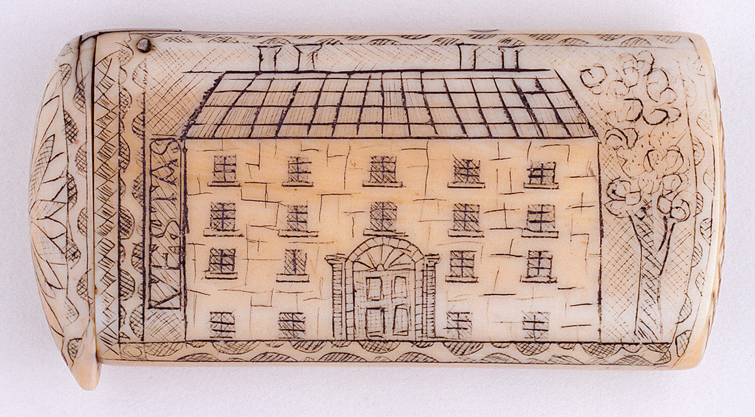 Georgian House Facade Matchsafe; possibly USA; ivory, pigment; 2.8 x 5.3 x .9 cm (1 1/8 x 2 1/16 x 3/8 in. ); Gift of Stephen W. Brener and Carol B. Brener; 1978-146-504