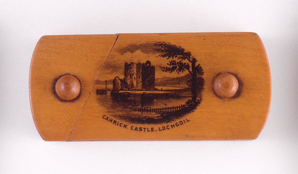 "Carrick Castle, Lochgoil" Matchsafe; Manufactured by William & Andrew Smith; wood, with transfer printed decoration; 3.2 x 7.3 x 2.3 cm (1 1/4 x 2 7/8 x 7/8 in. ); Gift of Stephen W. Brener and Carol B. Brener; 1978-146-75
