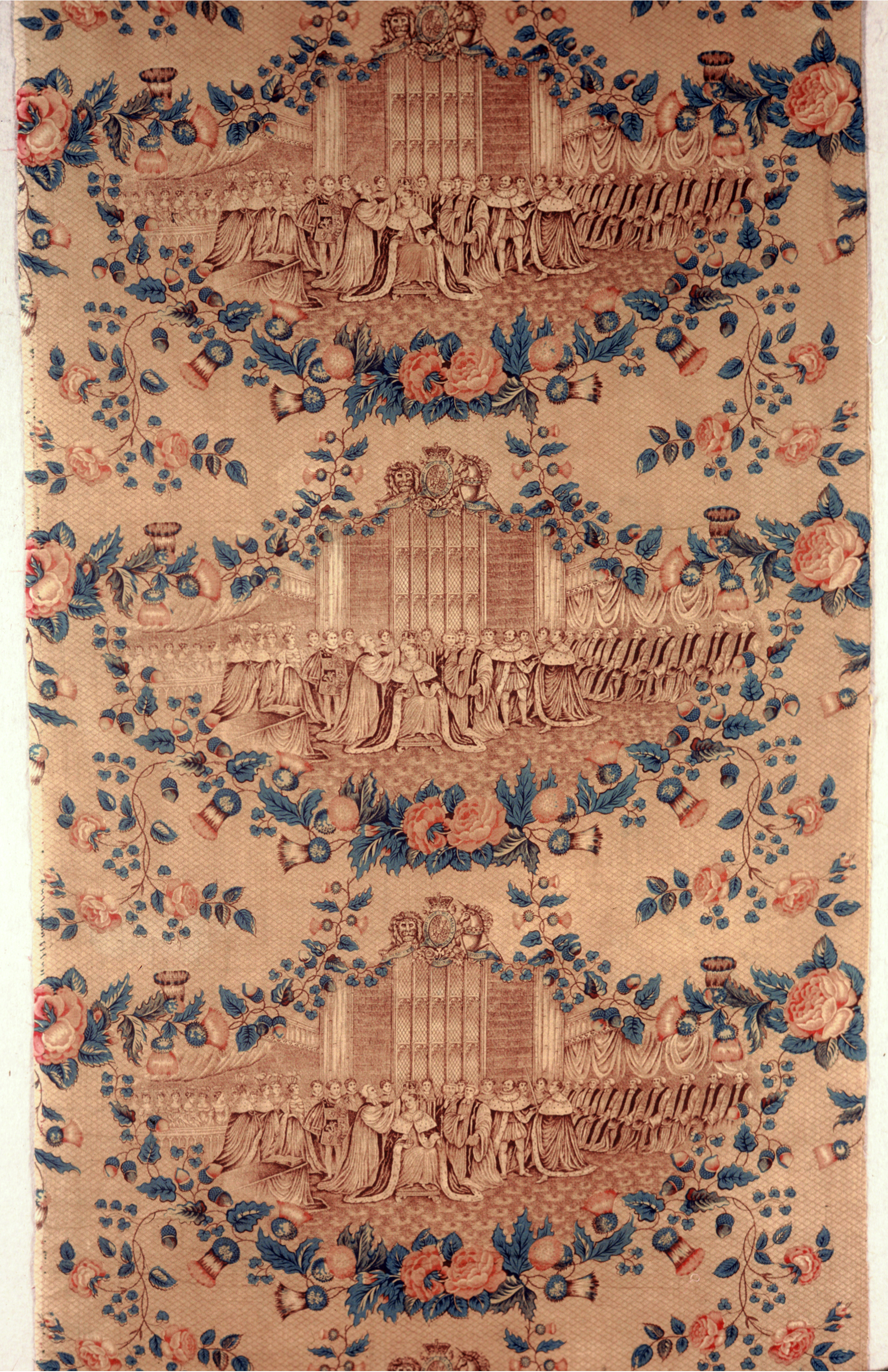 This is a Textile. It is dated ca. 1840 and we acquired it in 1978. Its medium is cotton and its technique is roller printed on plain weave. It is a part of the Textiles department.