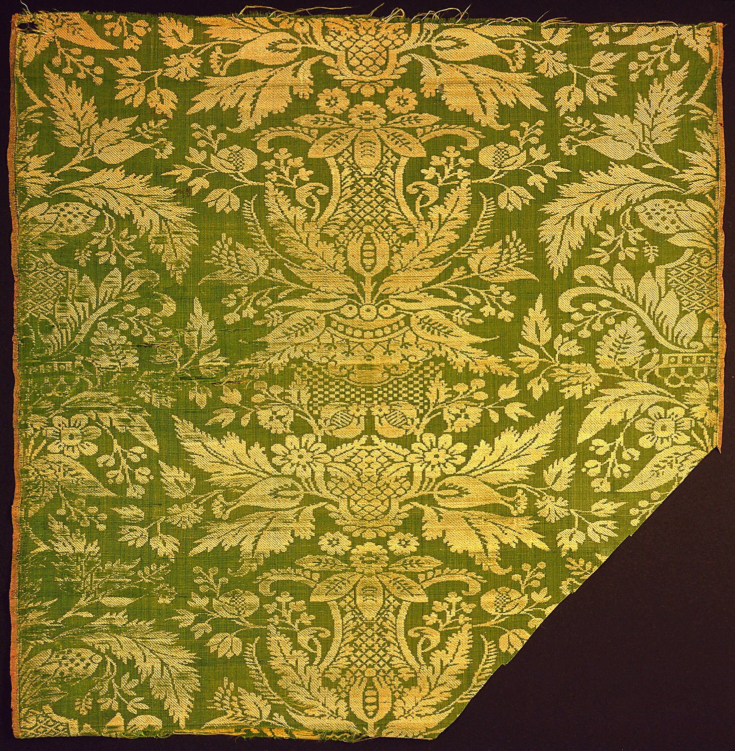 This is a Textile. It is dated ca. 1730 and we acquired it in 1978. Its medium is silk and its technique is plain weave with continuous supplementary weft bound on the front in 1/3 twill. It is a part of the Textiles department.