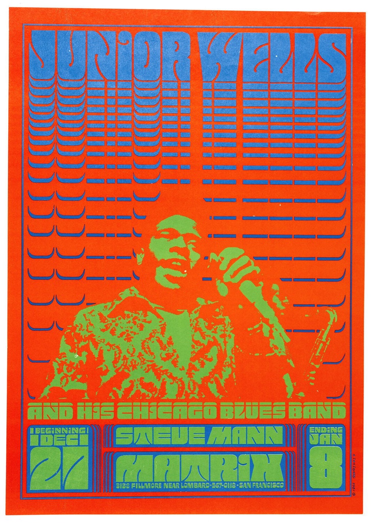 Poster, Junior Wells; Designed by Victor Moscoso (Spanish, active USA, b.1936); offset lithograph on white wove paper; H x W: 51 × 36.2 cm (20 1/16 × 14 1/4 in.); Gift of Mr. and Mrs. Leslie J. Schreyer; 1979-34-37