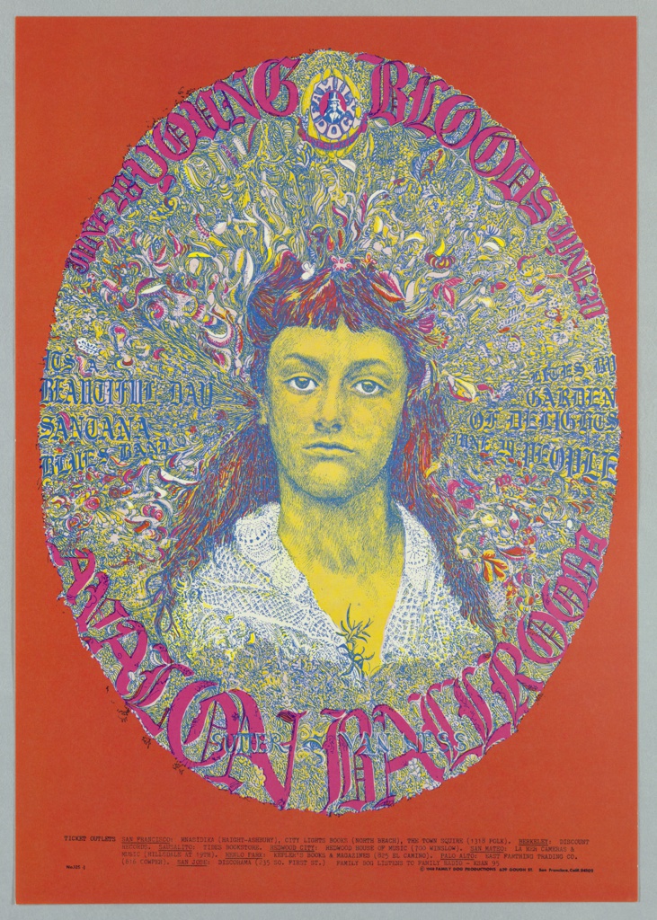 This is a Poster. It was printed by Family Dog Productions. It is dated 1968 and we acquired it in 1979. Its medium is offset lithograph on white wove paper. It is a part of the Drawings, Prints, and Graphic Design department.