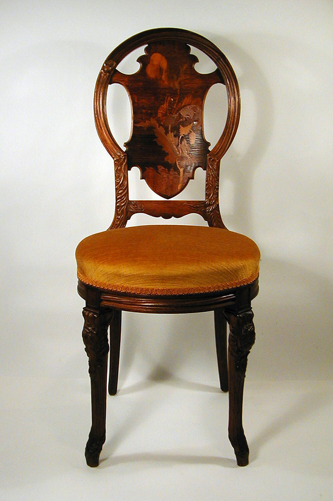 This is a side chair. It was designed by Emile Gallé and manufactured by Etablissement Gallé and retailed by Marshall Field and Co.. It is dated ca. 1900 and we acquired it in 1979. Its medium is pearwood, various woods (marquetry), upholstery (replaced). It is a part of the Product Design and Decorative Arts department.