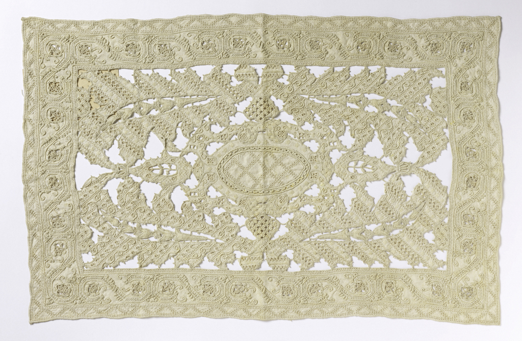 This is a panel. It was made by Arti Decorative Italiane. It is dated early 20th century and we acquired it in 1979. Its medium is linen and its technique is foundation: plain weave with deflected element work, withdrawn element work and cutwork. stitches: satin, whipped, overcast stem buttonhole stitches over a loop. It is a part of the Textiles department.