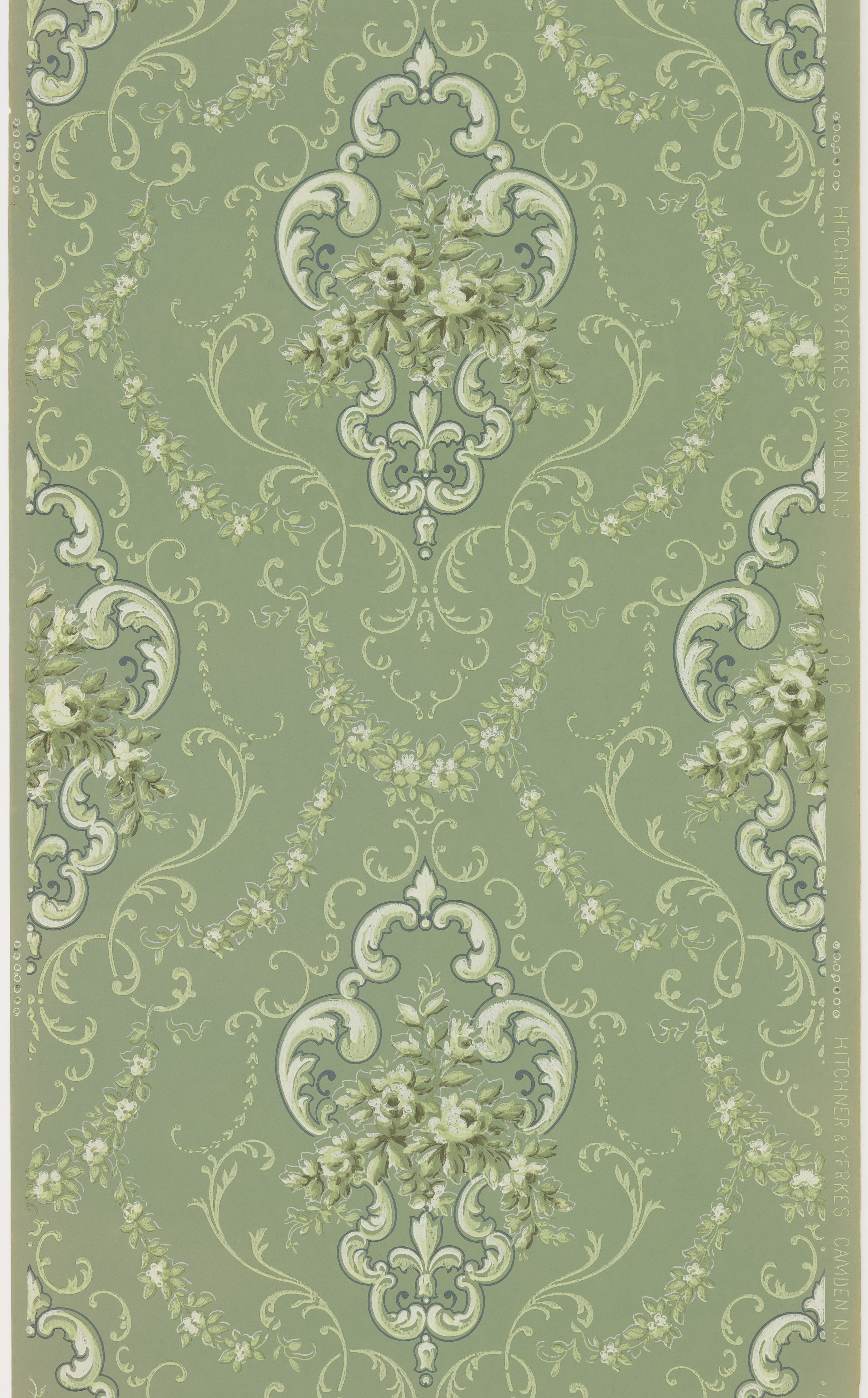 This is a Sidewall. It was manufactured by Hitchner and Yerkes. It is dated 1905–1915 and we acquired it in 1979. Its medium is machine-printed paper, liquid mica. It is a part of the Wallcoverings department.
