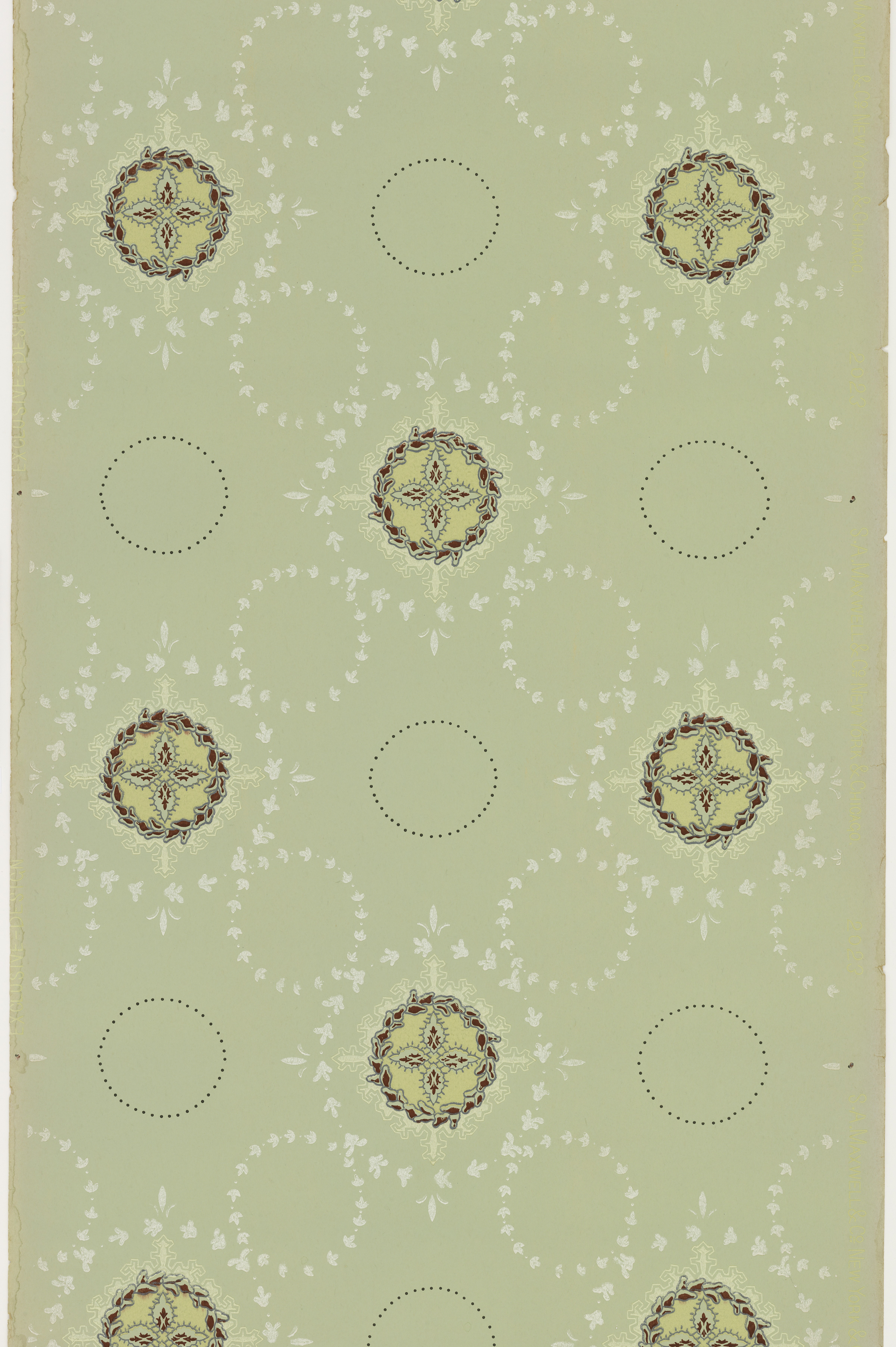 This is a Ceiling paper. It was manufactured by Maxwell & Co., S.A.. It is dated 1905–1915 and we acquired it in 1979. Its medium is machine-printed paper, liquid mica. It is a part of the Wallcoverings department.
