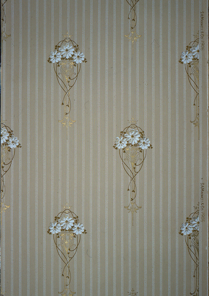 This is a Sidewall. It was manufactured by Maxwell & Co., S.A.. It is dated 1905–1915 and we acquired it in 1979. Its medium is machine-printed paper, liquid mica. It is a part of the Wallcoverings department.