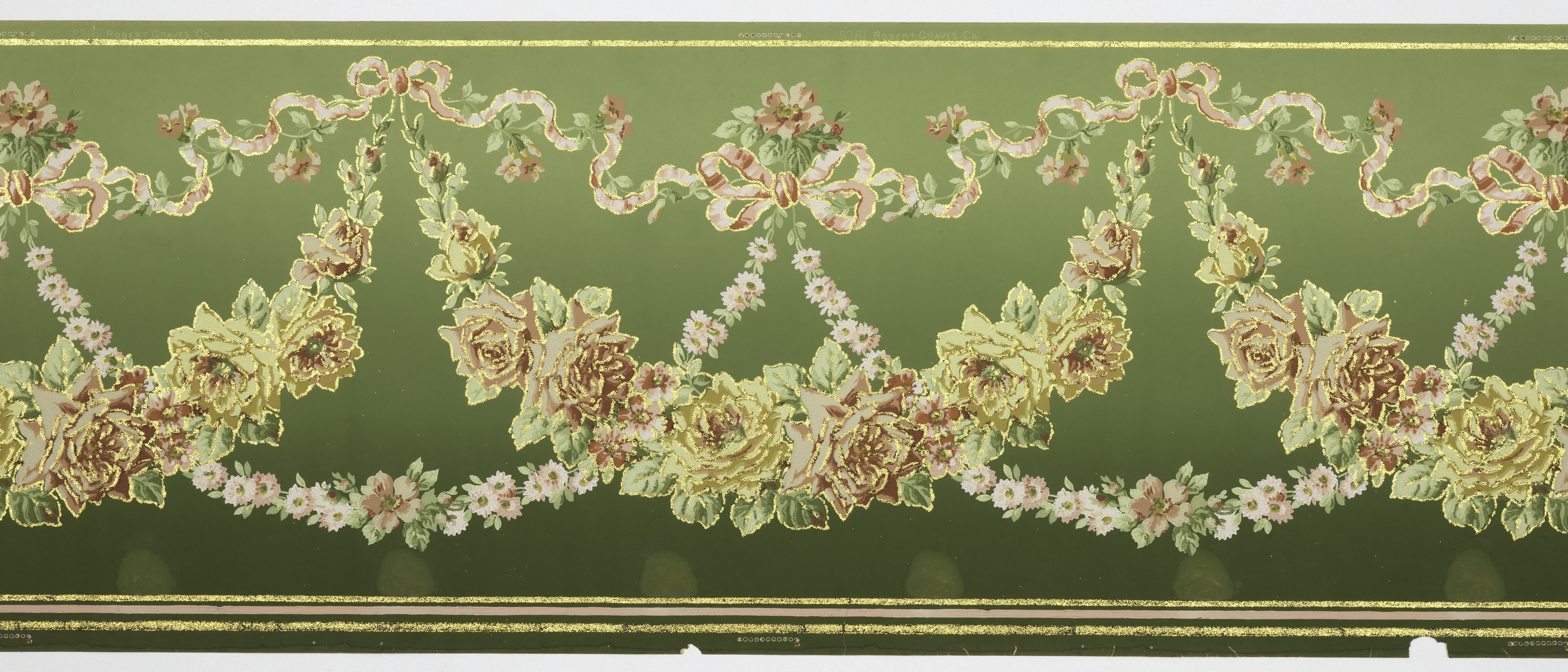 This is a frieze. It was manufactured by Robert Graves Co.. It is dated 1905–1915 and we acquired it in 1979. Its medium is machine-printed paper, mica flakes. It is a part of the Wallcoverings department.