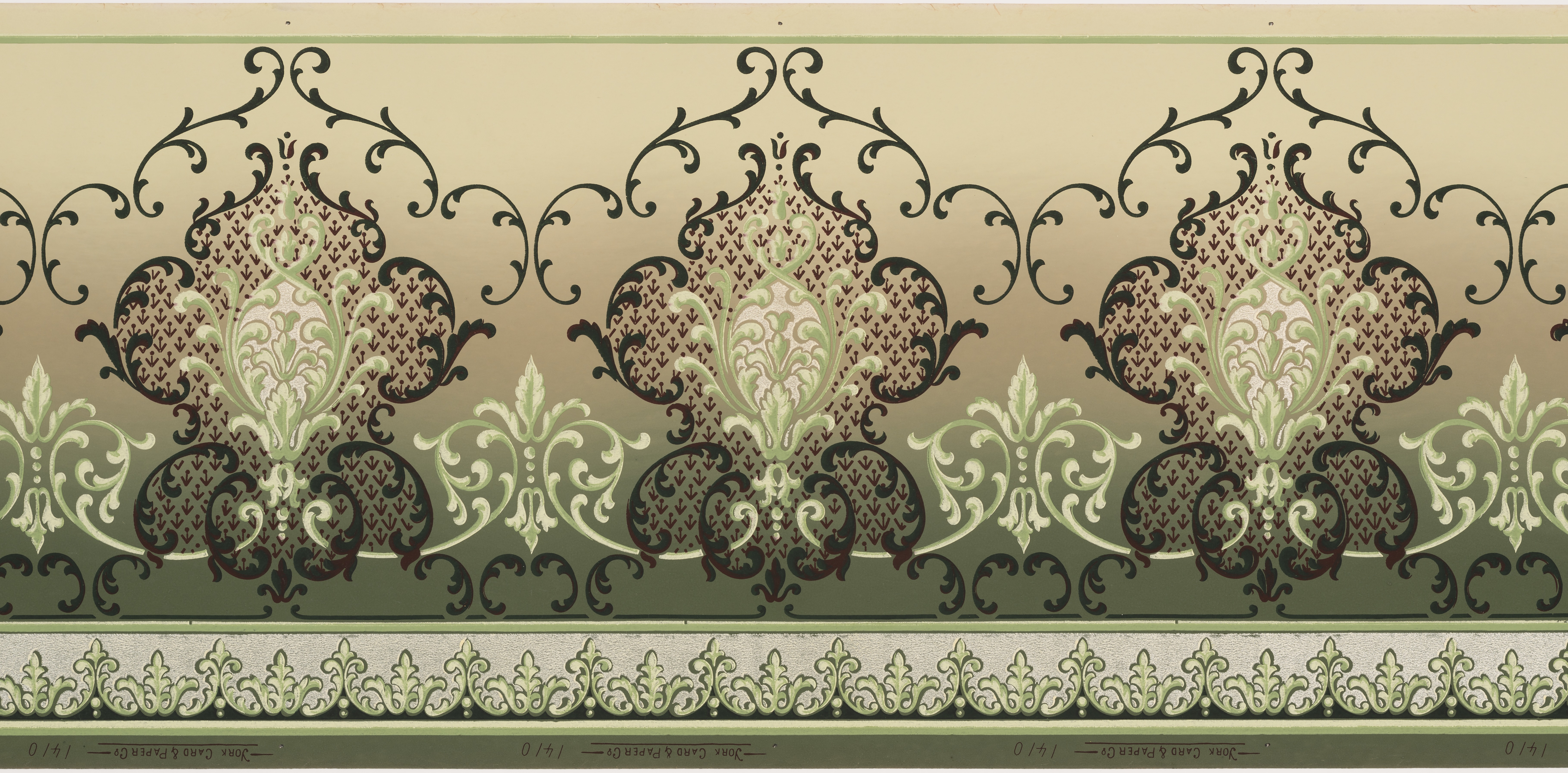 This is a frieze. It was manufactured by York Card & Paper Co.. It is dated 1905–1915 and we acquired it in 1979. Its medium is machine-printed paper, liquid mica. It is a part of the Wallcoverings department.