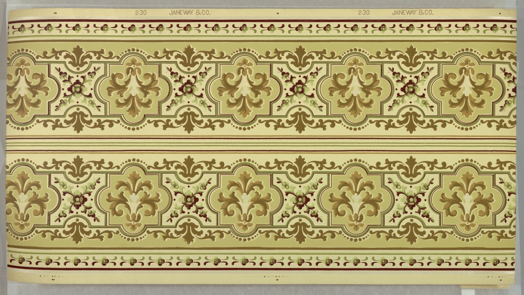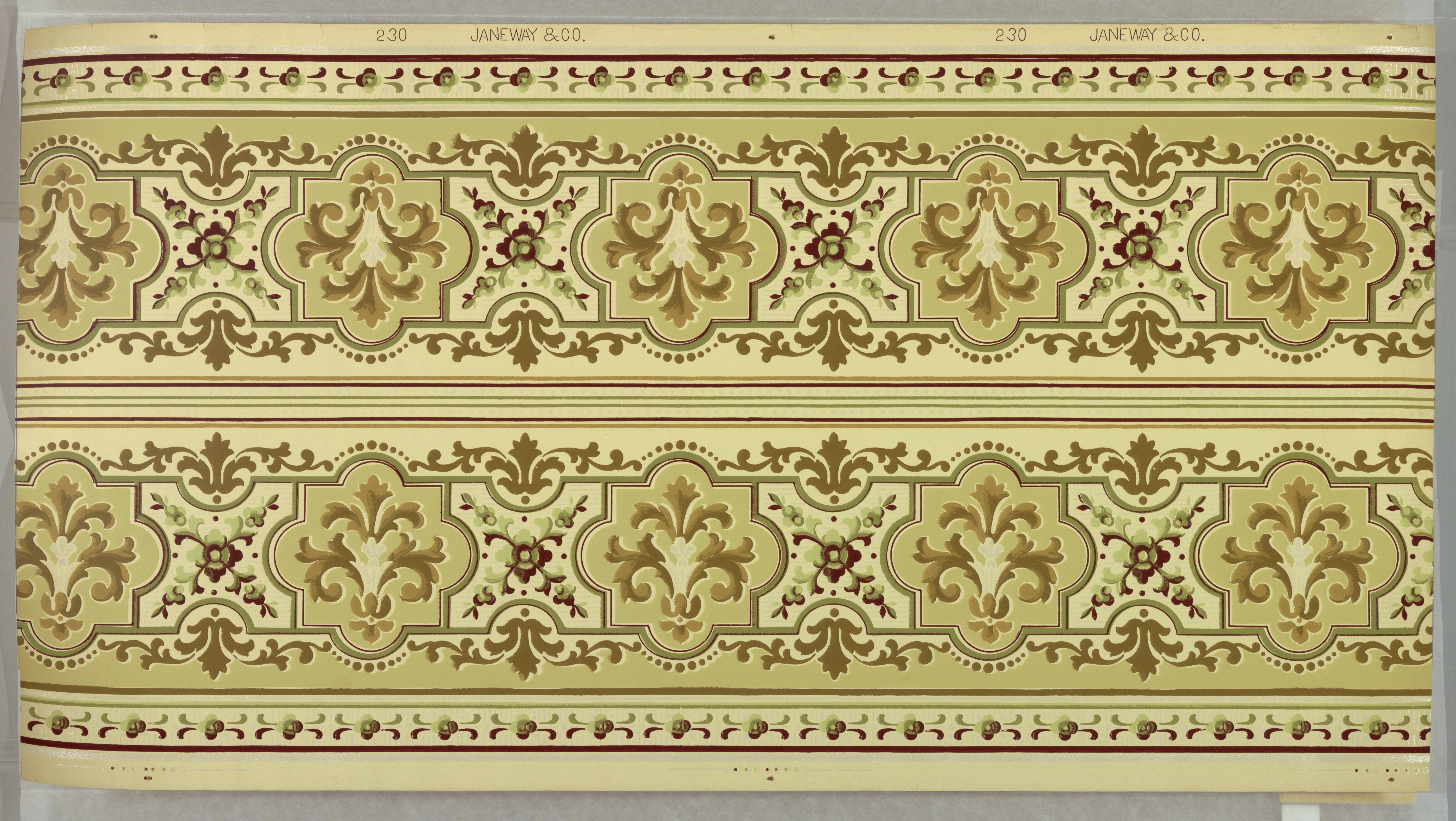 This is a frieze. It was manufactured by Janeway & Co. Inc.. It is dated 1905–1915 and we acquired it in 1979. Its medium is machine-printed paper. It is a part of the Wallcoverings department.