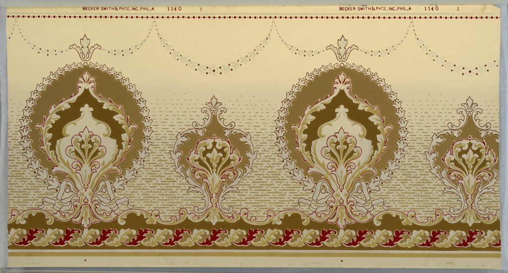 This is a frieze. It was made by Becker, Smith & Page, Inc.. It is dated 1905–1915 and we acquired it in 1979. Its medium is machine-printed paper, liquid mica. It is a part of the Wallcoverings department.