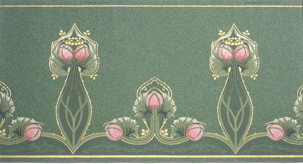 This is a frieze. It was manufactured by York Card & Paper Co.. It is dated 1905–1915 and we acquired it in 1979. Its medium is machine printed oatmeal paper. It is a part of the Wallcoverings department.