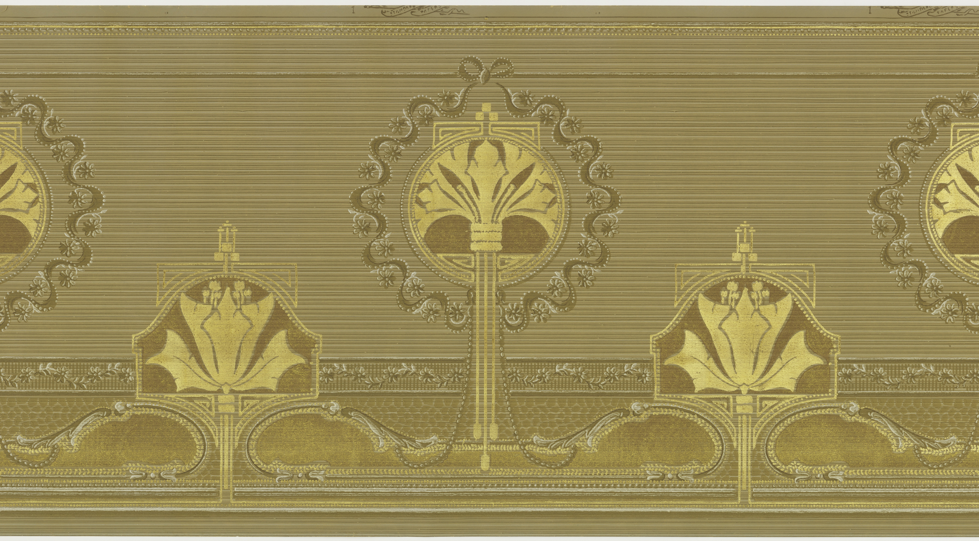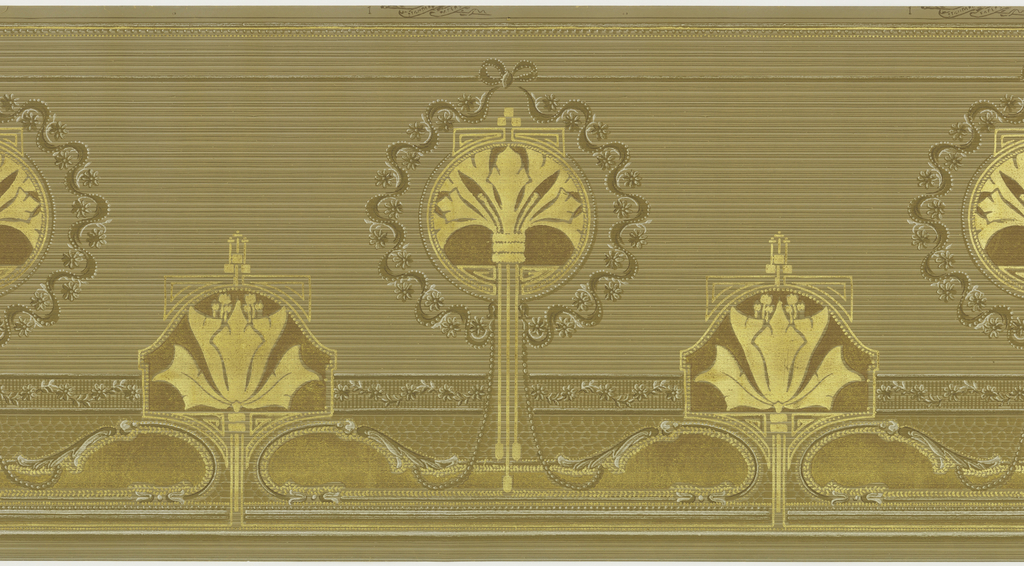 This is a frieze. It was manufactured by Standard Wall-Paper Company. It is dated 1905–1915 and we acquired it in 1979. Its medium is machine-printed paper. It is a part of the Wallcoverings department.