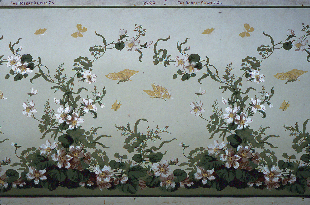 This is a frieze. It was manufactured by Robert Graves Co.. It is dated 1905–1915 and we acquired it in 1979. Its medium is machine-printed paper, liquid mica. It is a part of the Wallcoverings department.