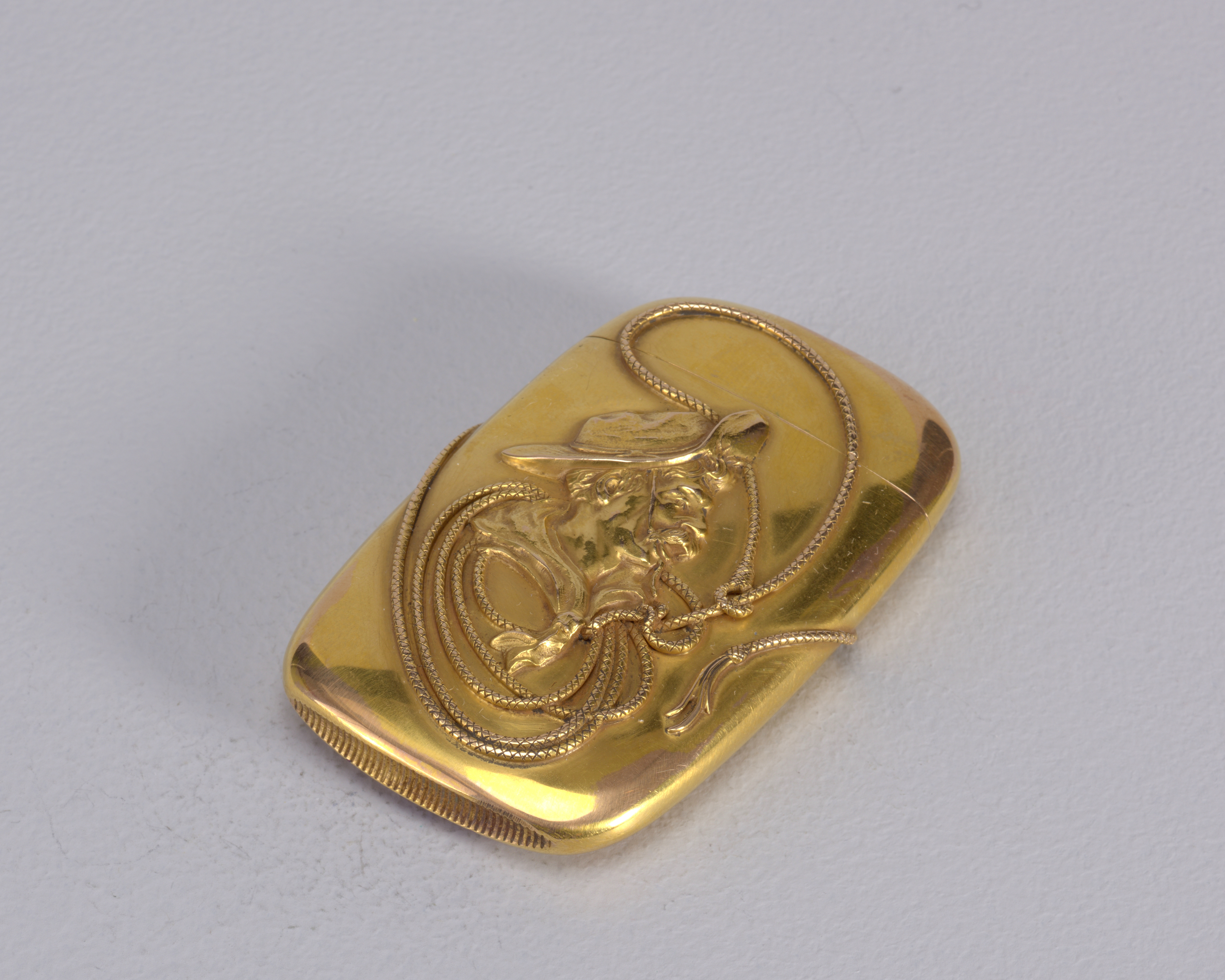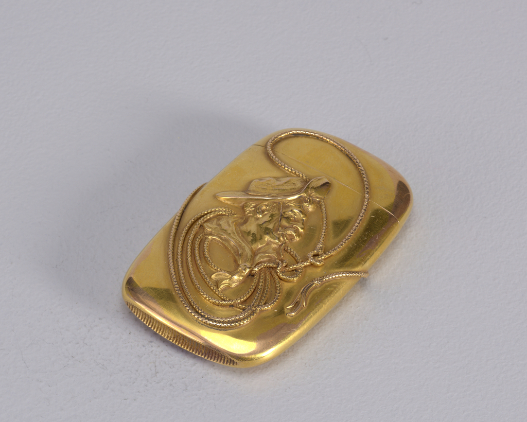 Cowboy and Lasso Matchsafe; Manufactured by Shreve & Co.; USA; gold; 6 x 3.7 x .8 cm (2 3/8 x 1 7/16 x 5/16 in. ); Gift of Stephen W. Brener and Carol B. Brener; 1980-14-191