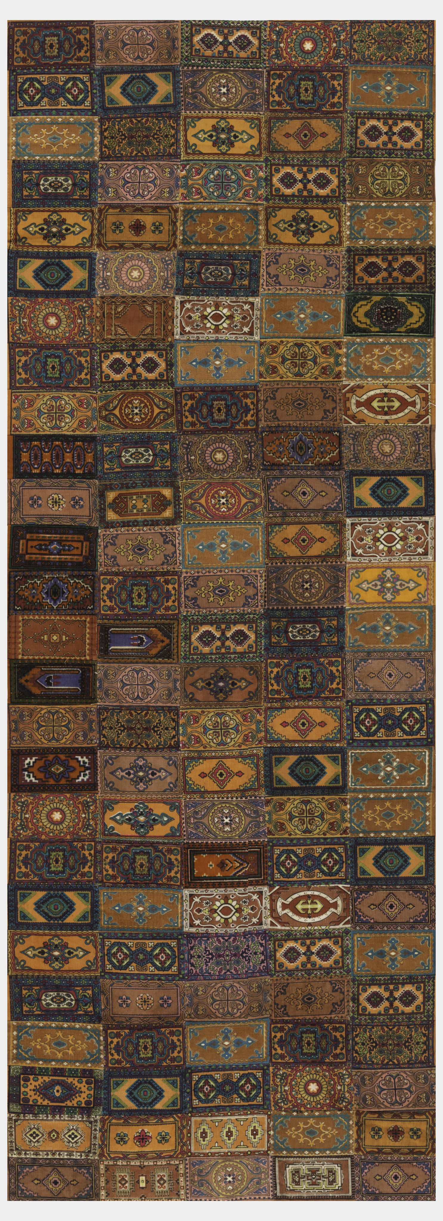 This is a Patchwork panel. It is dated ca. 1910 and we acquired it in 1985. Its medium is cotton and its technique is roller printed on supplementary weft pile (velveteen), stitching. It is a part of the Textiles department.