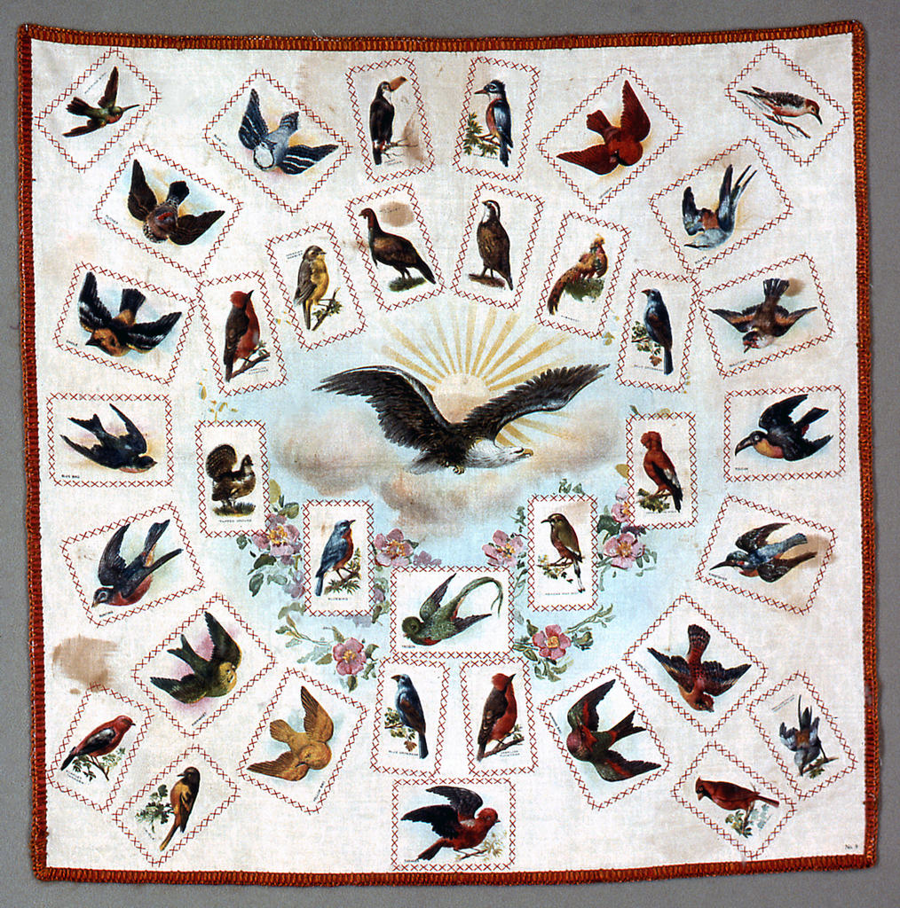 This is a panel. It is dated ca. 1910 and we acquired it in 1985. Its medium is silk on cotton and its technique is chromolithograph on 4&1 satin, buttonhole stitches. It is a part of the Textiles department.