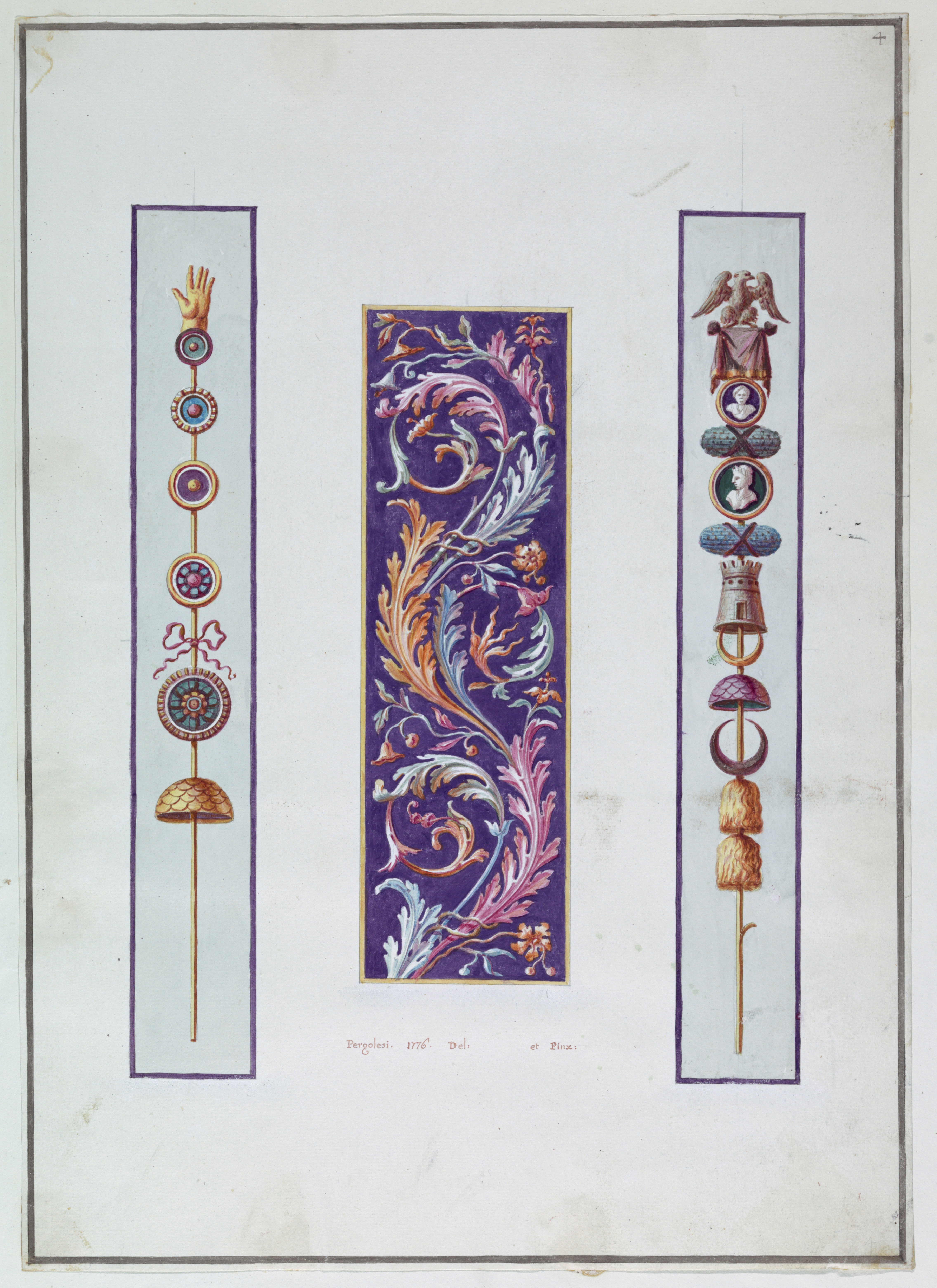 Drawing, Ornament Design, Arabesque Panel between Roman Standards; Michel Angelo Pergolesi (Italian, active ca. 1760–1801); pen and ink, brush and watercolor, gouache, over graphite on laid paper; 48.3 × 34.3 cm (19 in. × 13 1/2 in.) Mount: 71.8 × 50.8 cm (28 1/4 in. × 20 in.); Gift of Unknown Donor; 1980-32-1414