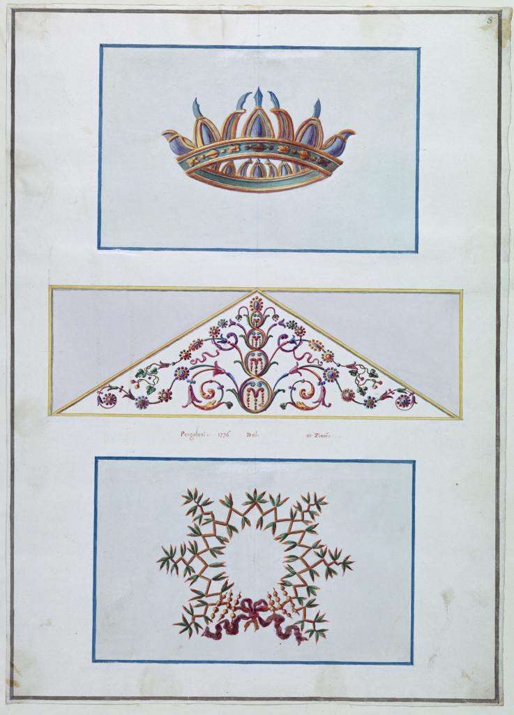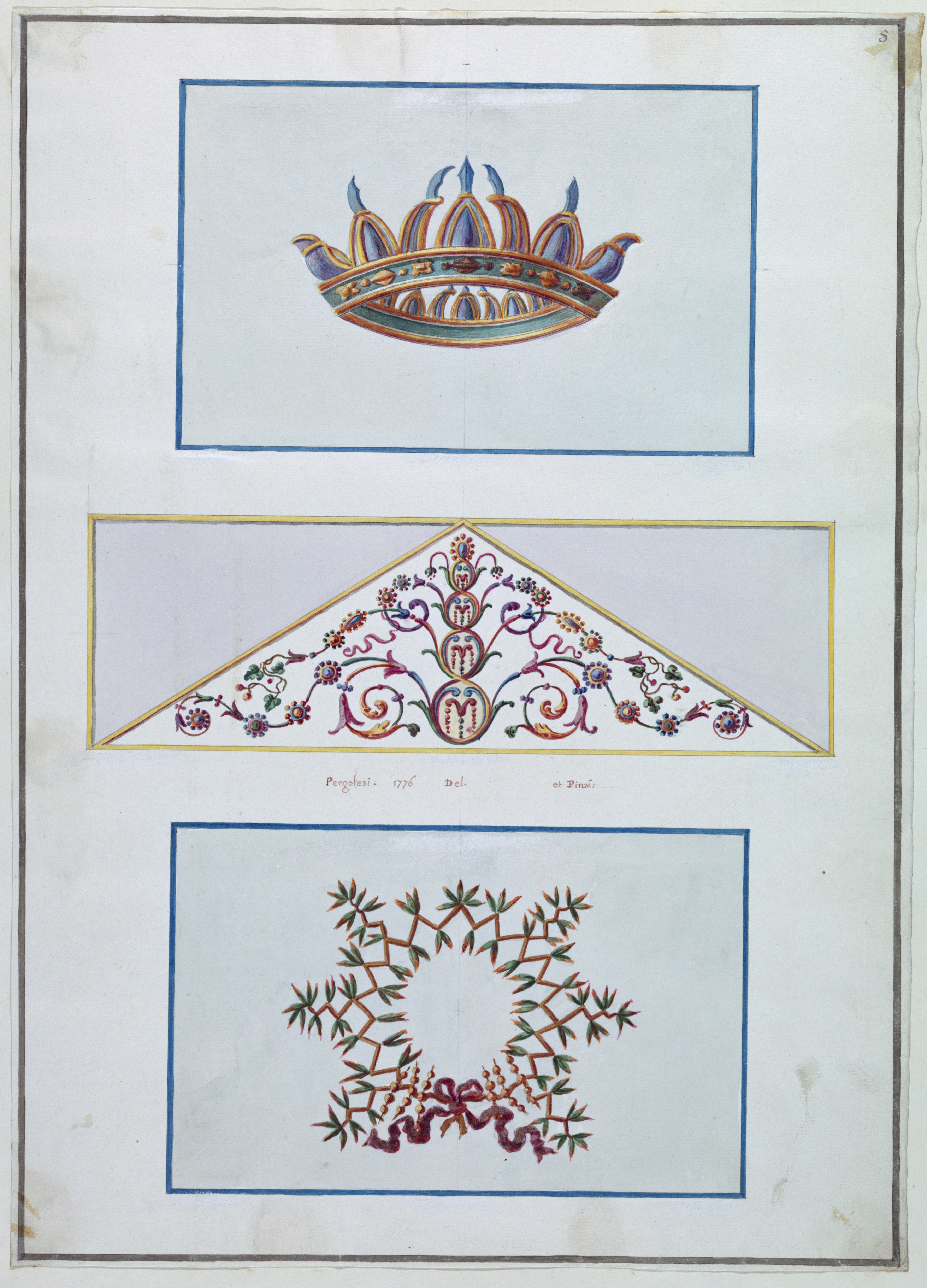 Drawing, Ornament Design, Triangular Arabesque Panel between Roman Naval and Grass Crowns; Michel Angelo Pergolesi (Italian, active ca. 1760–1801); pen and ink, brush and watercolor, gouache, over graphite on laid paper; Mount: 71.8 × 50.8 cm (28 1/4 in. × 20 in.) Sheet: 48.3 × 34.3 cm (19 in. × 13 1/2 in.) Center Design Motif: 9.1 × 28.6 cm (3 5/8 × 11 1/4 in.) Lower Design Motif: 14.2 × 22.2 cm (5 5/8 × 8 3/4 in.); Gift of Unknown Donor; 1980-32-1415