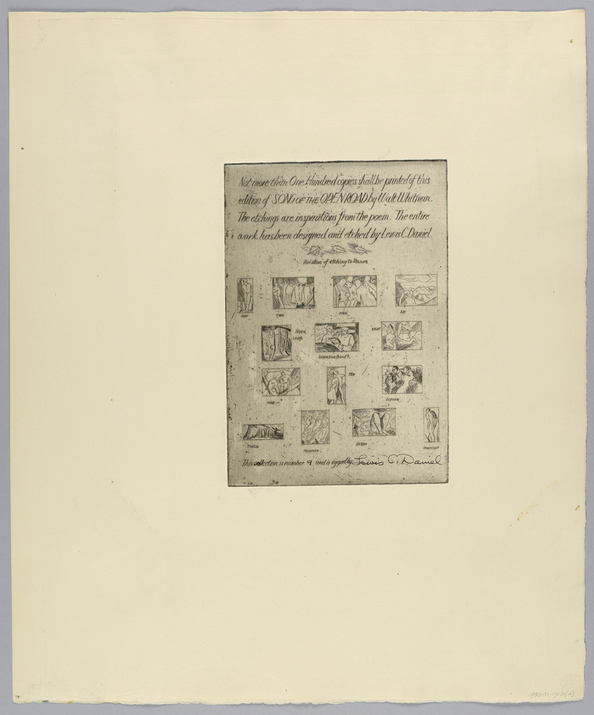 Print, Song of the Open Road (Colophon); Written by Walt Whitman (1819 – 1892); etching and soft ground in black ink on cream wove paper; 45.7 × 37.5 cm (18 × 14 3/4 in.); Gift of Unknown Donor; 1980-32-1710-2