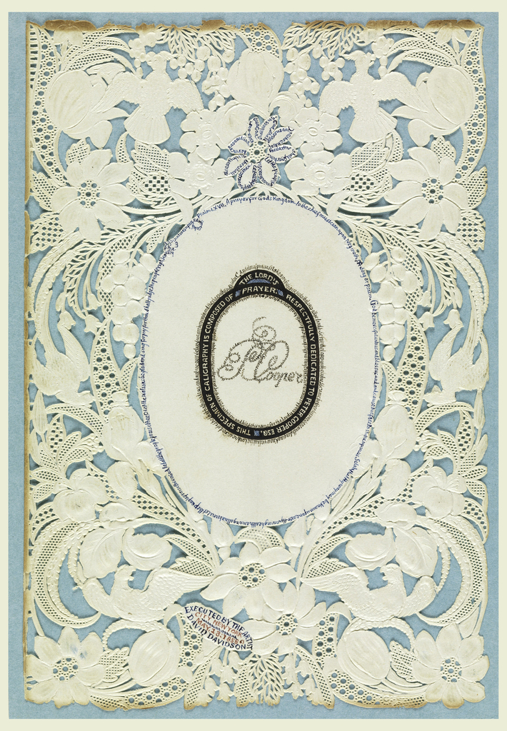 <ref name=CH>{{cite web |url=https://www-6.collection.cooperhewitt.org/objects/18510093/ |title=Paper Cut-out, The Lord's Prayer paper cut-out |author=Cooper Hewitt, Smithsonian Design Museum |accessdate=20 December 2025 |publisher=Smithsonian Institution}}</ref>