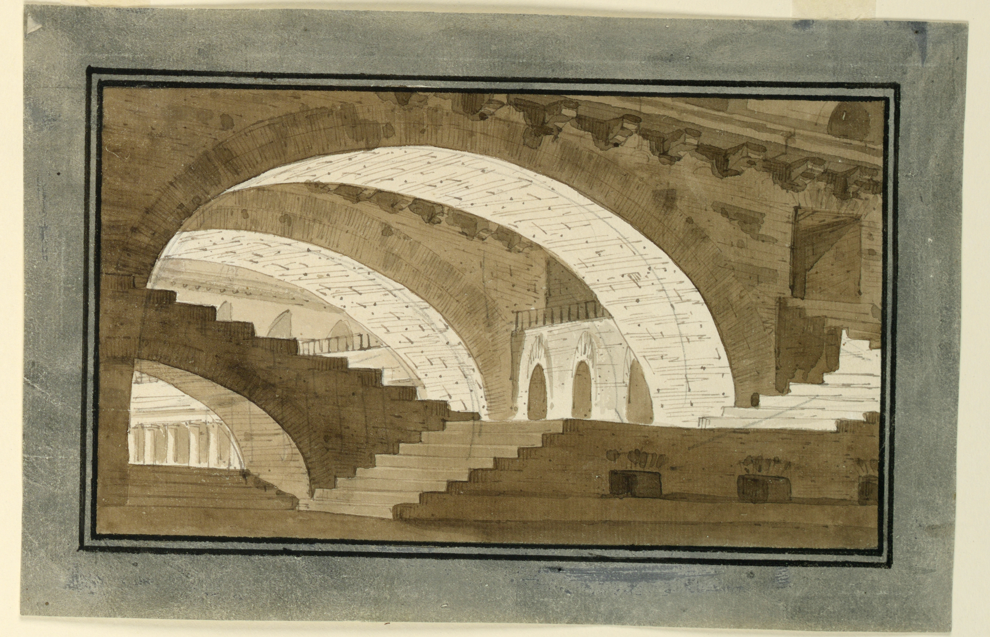 Drawing, Stage Design, Interior of Basement of Palace; Designed by Angelo Toselli (ca. 1765? – 1826); Italy; pen and sepia ink, brush and wash on paper; H x W: 16.8 × 25.9 cm (6 5/8 × 10 3/16 in.); Museum purchase through gift of various donors and from Eleanor G. Hewitt Fund; 1938-88-321