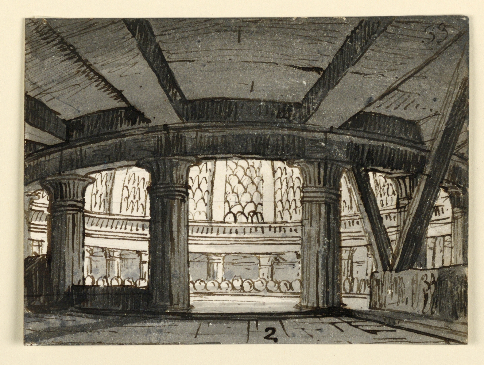 Drawing, Interior of Circular Building; Possibly by Antonio Giuseppe Basoli (Italian, 1774–1843); Italy; pen and bistre ink, brush and sepia wash on paper; H x W: 9 × 12.2 cm (3 9/16 × 4 13/16 in.); Museum purchase through gift of various donors and from Eleanor G. Hewitt Fund; 1938-88-332