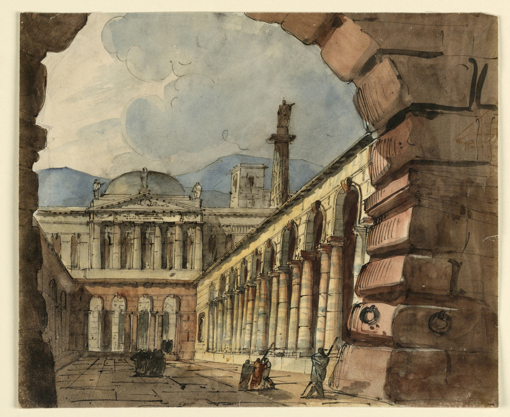 Drawing, Stage Design, Exterior of Palace; Italy; pen and bistre ink, brush and sepia wash on paper; H x W: 19.1 × 23.1 cm (7 1/2 × 9 1/8 in.); Museum purchase through gift of various donors and from Eleanor G. Hewitt Fund; 1938-88-392
