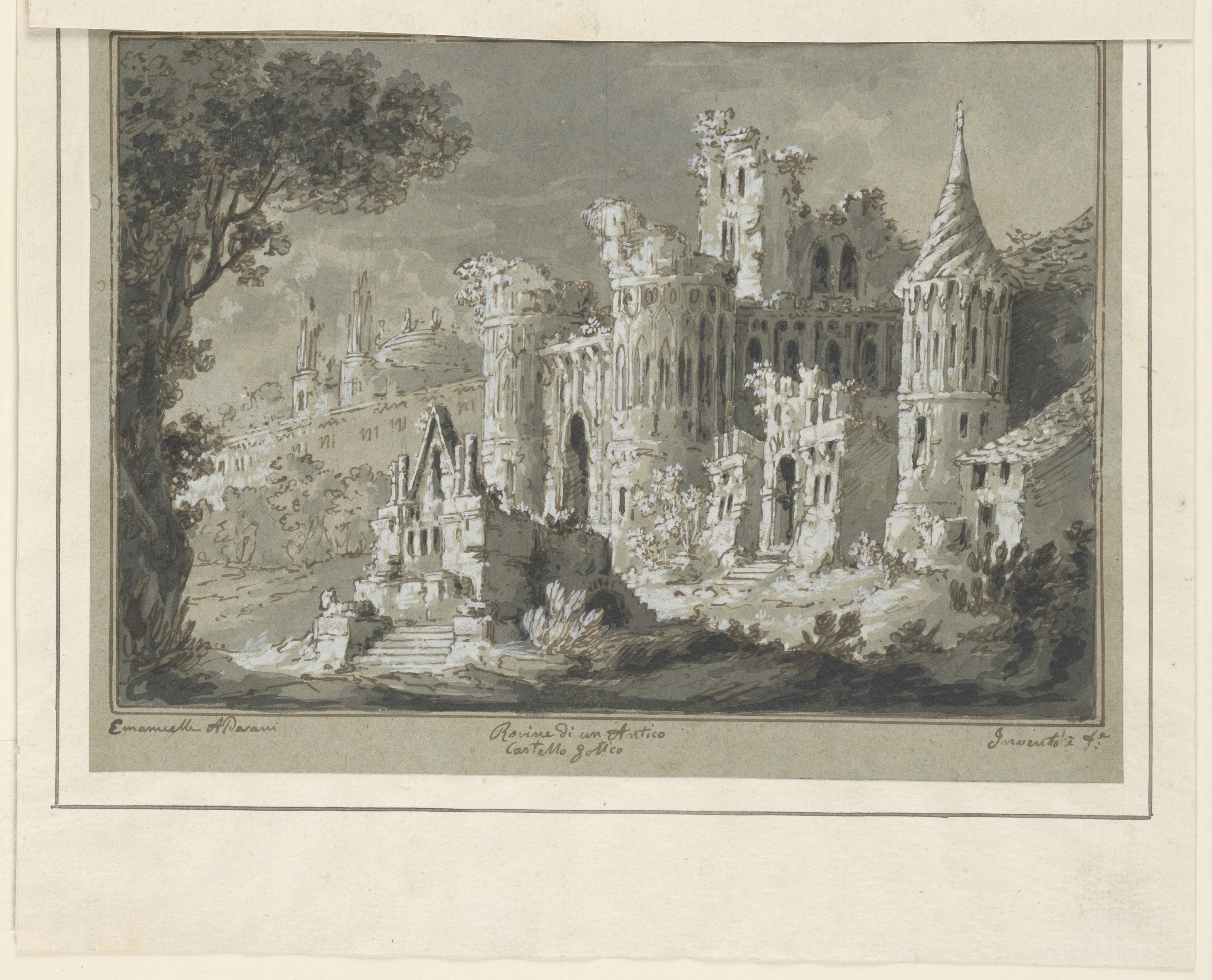 Inscribed in pen and brown ink, lower left margin: Emanuelle Alderani; at center: Rouine di un Antico / castello gotico; at lower right: Invento e fe