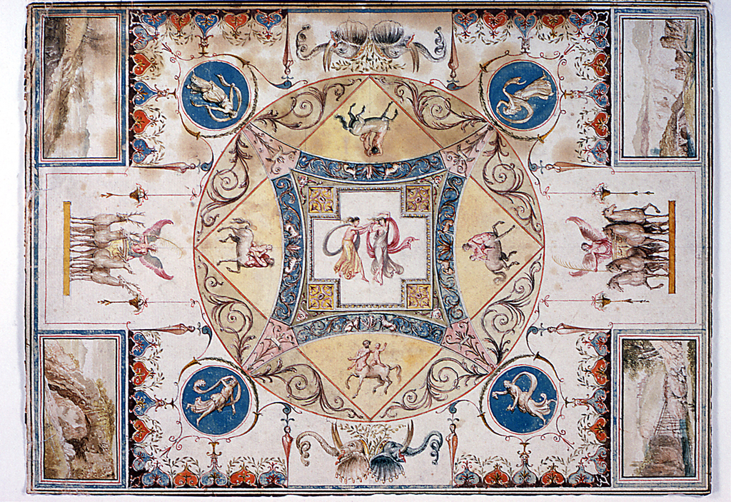 Drawing, Ceiling in Hadrian's Villa, with Nymphs, Centaurs, Stags, and Elephants; Architect: Unknown (Italian); Italy; pen and colored inks, brush and watercolor, guache, over traces of graphite on paper; 27.7 x 38.4 cm (10 7/8 x 15 1/8 in.); Museum purchase through gift of various donors and from Eleanor G. Hewitt Fund; 1938-88-4830