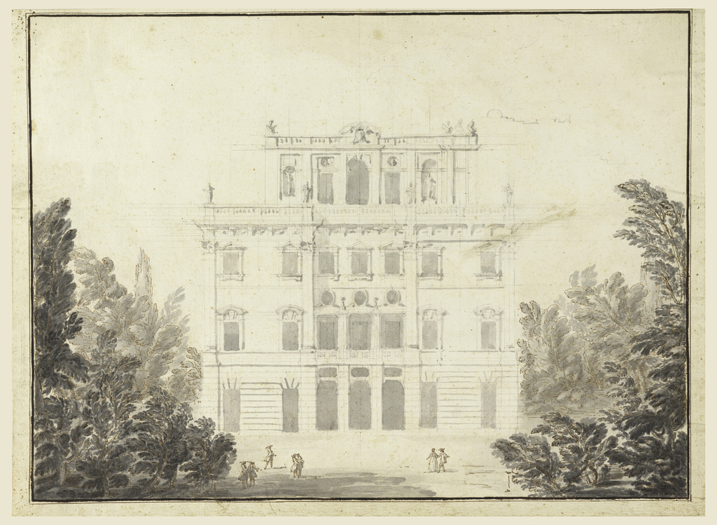 Drawing, Design for a Casino in a Park; Designed by Carlo Marchionni (Italian, 1702–1786); Italy; brush and gray watercolor, pen and sepia ink on laid paper; 35.5 x 48.7 cm (14 in. x 19 3/16 in.); Museum purchase through gift of various donors and from Eleanor G. Hewitt Fund; 1938-88-489