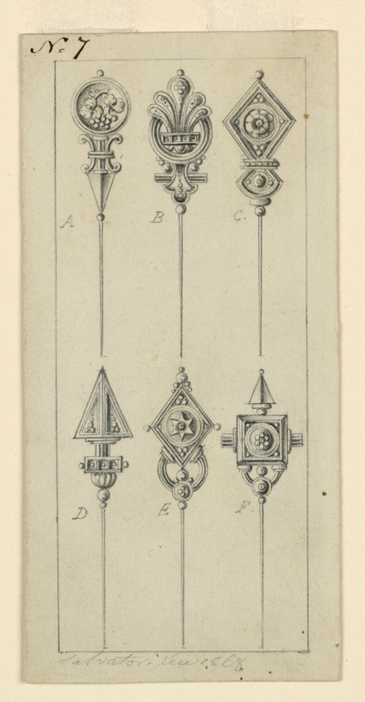 Drawing, Designs for six pins; Made by Salvatori (Italian, active 19th century); Italy; Museum purchase through gift of various donors and from Eleanor G. Hewitt Fund; 1938-88-6299