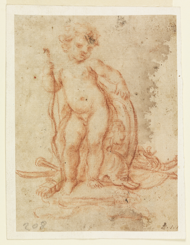 Drawing, Design for Cupid and Trophy of Arms; Paolo de Mattheis (Italian, 1662 - 1728); Italy; red chalk on paper; 13.2 x 9.8 cm (5 3/16 x 3 7/8 in.); Museum purchase through gift of various donors and from Eleanor G. Hewitt Fund; 1938-88-6441
